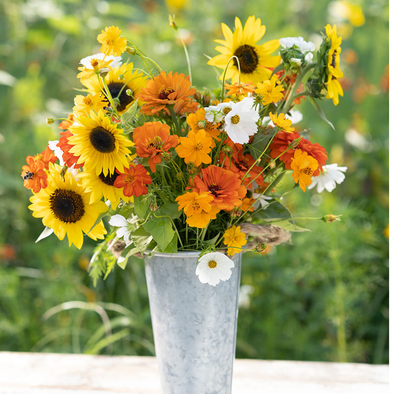 80% Annual, 20% Perennial: Cosmos Bright Lights, Cosmos Purity, Cosmos Sulphur Yellow, Zinnia Orange King, Sunflower Henry Wilde, Corn Marigold. Mix contents are subject to change.