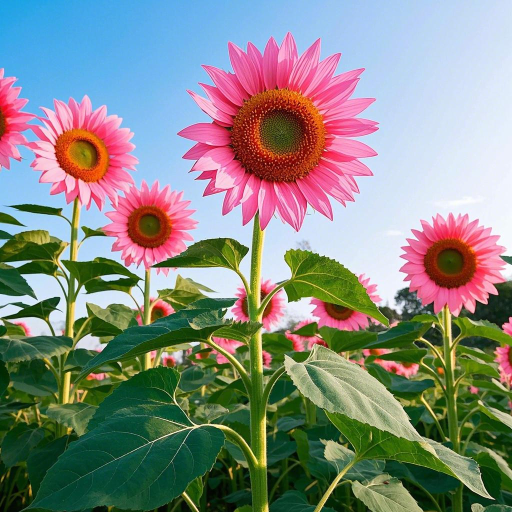 🌷 Unique pink petals – breaking through the traditional yellow sunflowers, the pink flowers are like the morning glow in the sky, adding elegance and warmth to the garden.